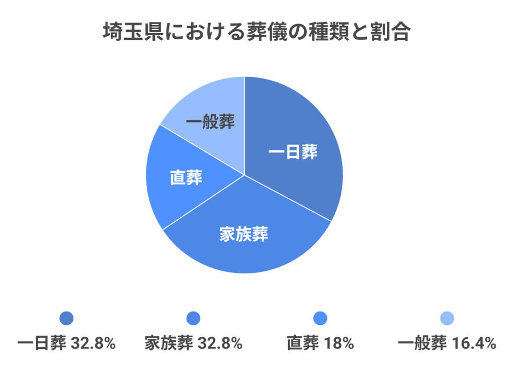 埼玉県全体の葬儀種類別統計を見ると、一日葬と家族葬がそれぞれ32.8%と同率で最も多く選ばれており、従来の一般葬の16.4%を大きく上回っています。この数字からも、一日葬が埼玉県内のご家族様にとって身近な選択肢となっていることがわかります。