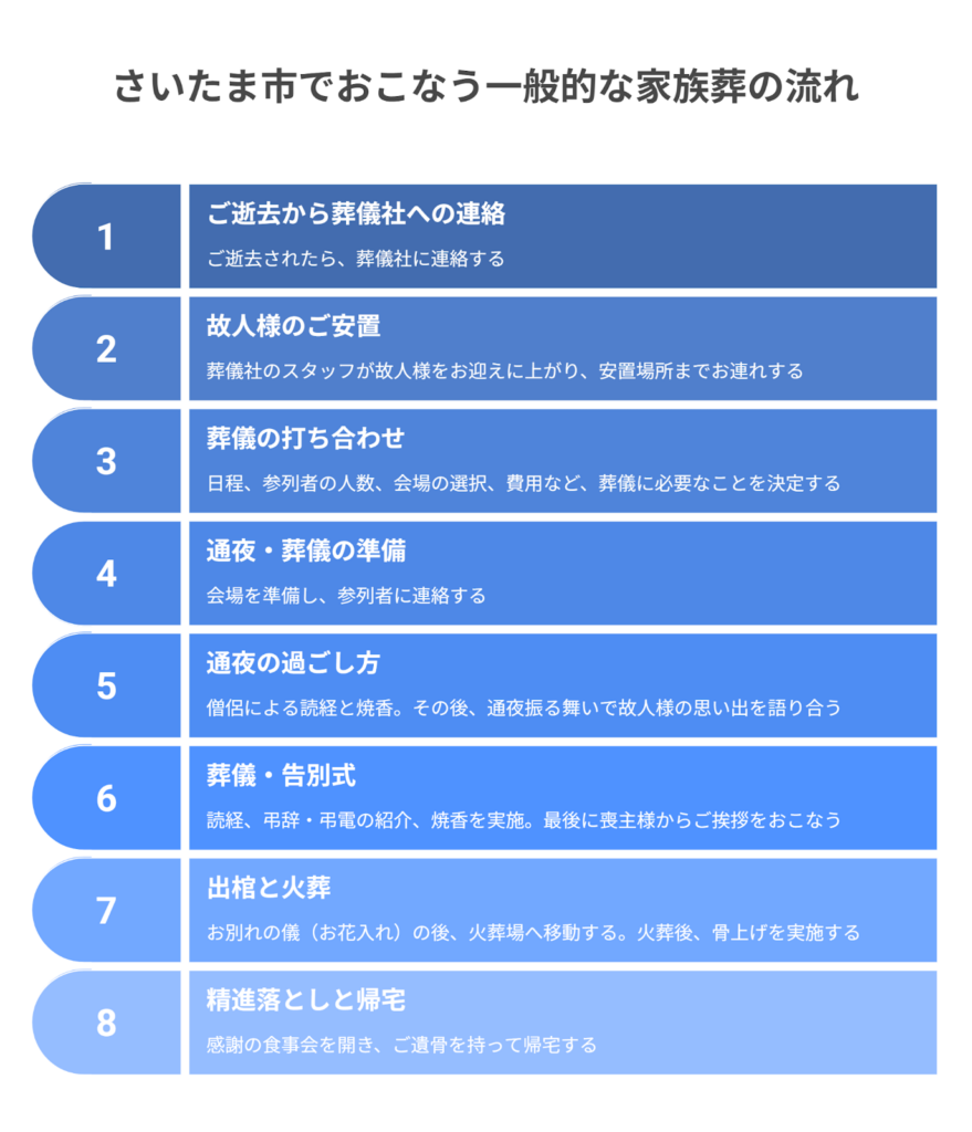 実際にさいたま市で自宅のような落ち着いた空間の家族葬を行う場合、どのような流れになるのかをご説明します。ここでは、さいたま市で家族葬をおこなう際の一般的な流れをご紹介します。
